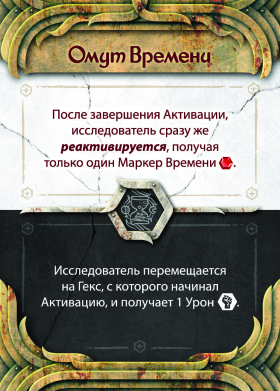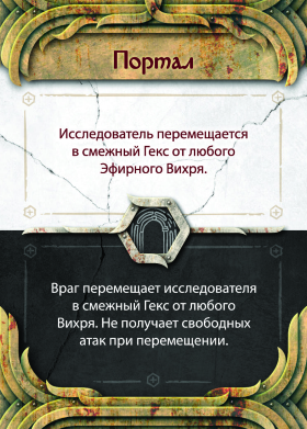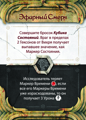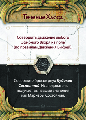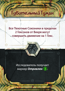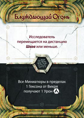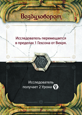 Если текст карты ссылается на Исследователя, то под ним подразумевается Миниатюра, которая спровоцировала эффект: исследовала, не исследовала или попала в Вихрь. Если эффект просит произвести измерение дистанции от Эфирного Вихря, которого уже нет на Игровом Поле, то измерение производятся от Гексона, который занимал Вихрь последний раз.
